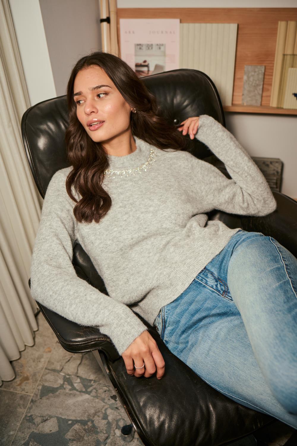 – Mønster: melert og strass/perler i halsen